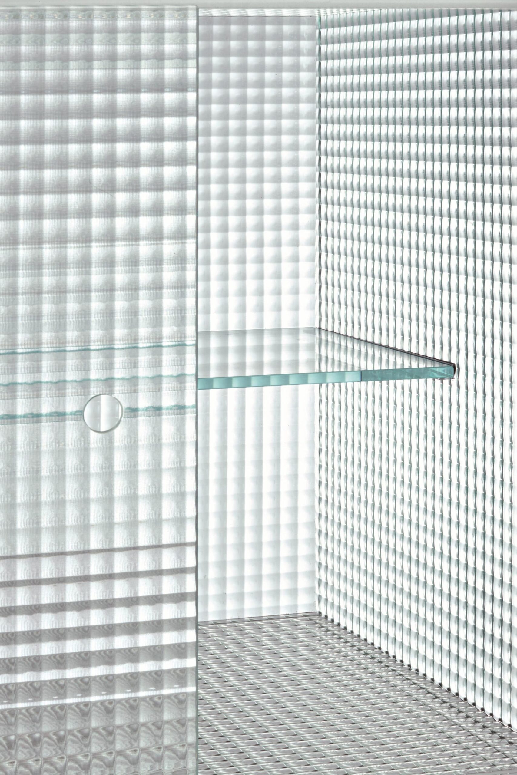 Commodore is a charming crystal highboard in striped or checked printed glass, tempered and glued 45°, with silvered base. The sliding doors run in transparent plexiglass tracks, whilst the slender legs are in glossy chromium-plated metal. Commodore is available in 2 versions, high or low, supplied with 8 mm. thick tempered extralight glass shelves.