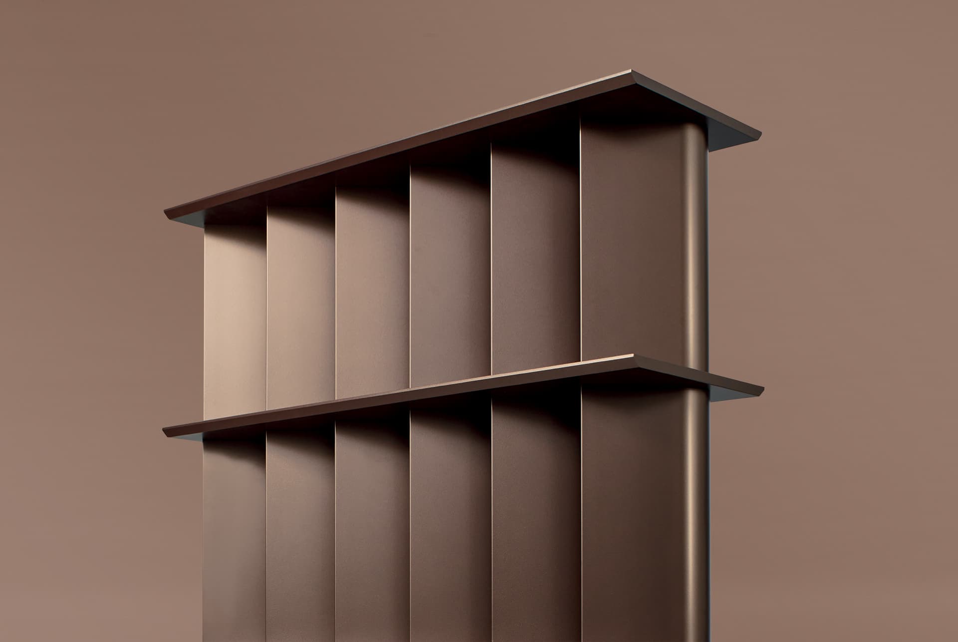 Dogma is a bookcase and room divider designed with the idea of playing with volumes and juxtaposing different modules to create a variety of visual effects. It is distinguished by the drop-shaped uprights that change the visual perception: the design becomes rounded and soft or sharper and narrower depending on the angle from which it is viewed.