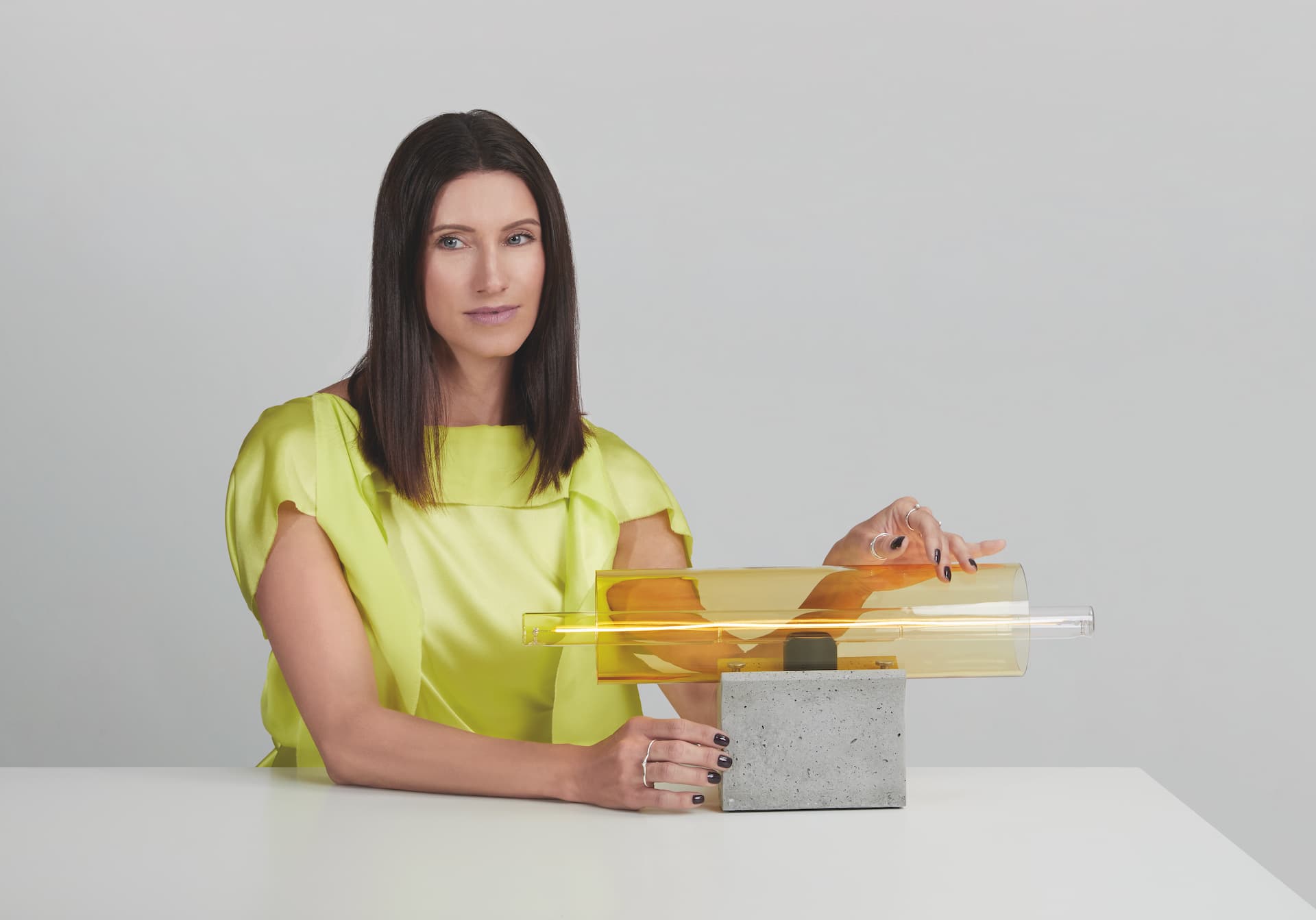 Overlay is a precious lamp made of three different types of glass: the light tube is crafted from hand-blown glass; the concrete base is embedded with 3-4 mm glass shards for an attractive aesthetic element; and crushed glass is used in place of sand as the primary binder. A classic contemporary lighting sculpture with an extravagant style and clean geometric forms.