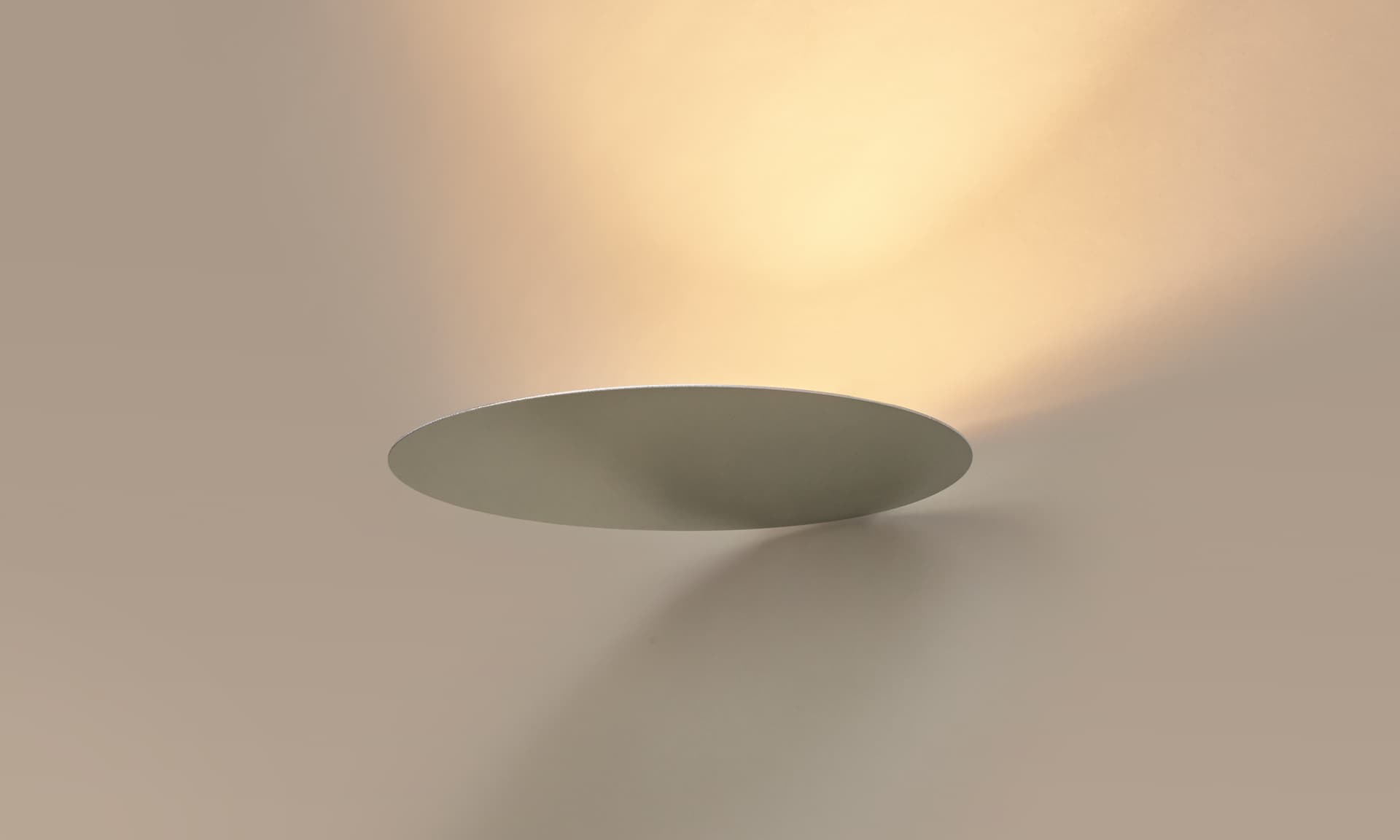 Millimetro is a wall lamp composed of a very thin circular reflecting disk to produce enveloping, warm light that spreads from below up to the ceiling. The LED module is placed above the disk and protected by a screen that projects uniform light without creating shadows. The lamp contributes to the definition of the surrounding setting through a continuous game of luminescent rebounds.